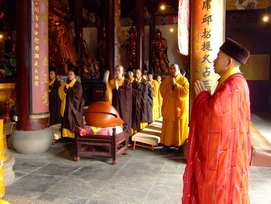 为满足春节期间,信众请佛像的需求,在普仁大和尚的主持下,全体僧众诵经,为西园寺大殿及流通处所有佛像开光、洒净。