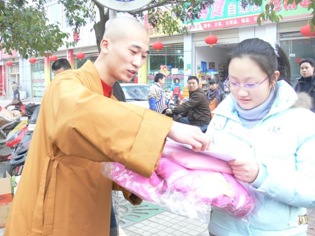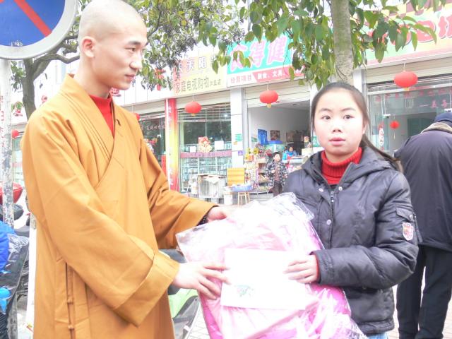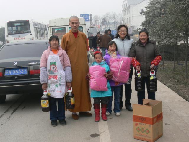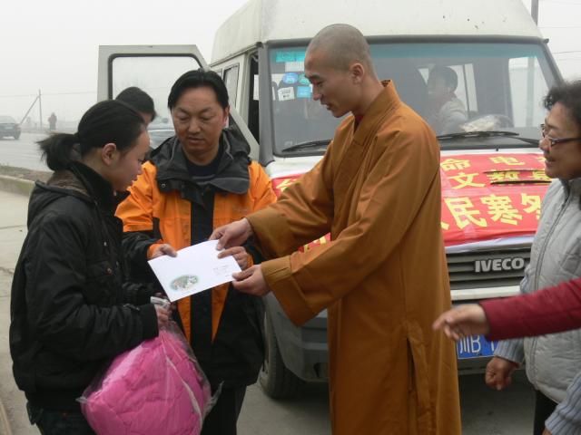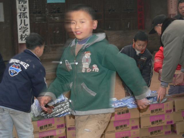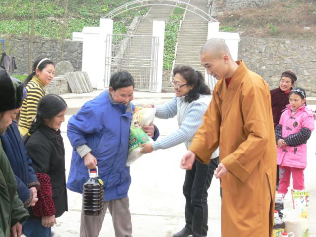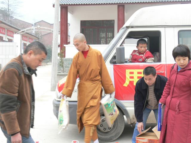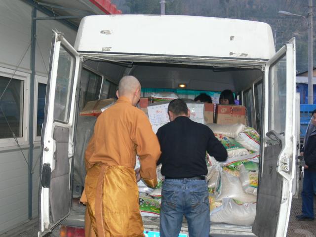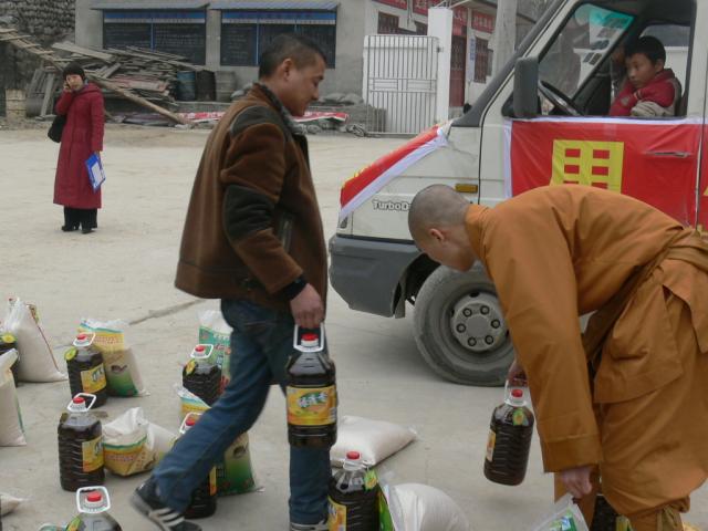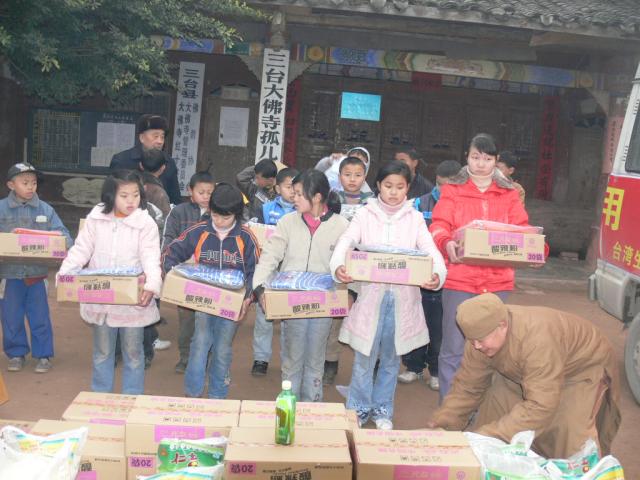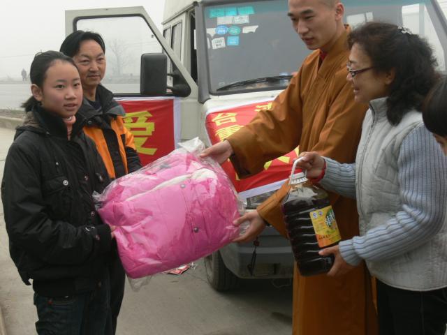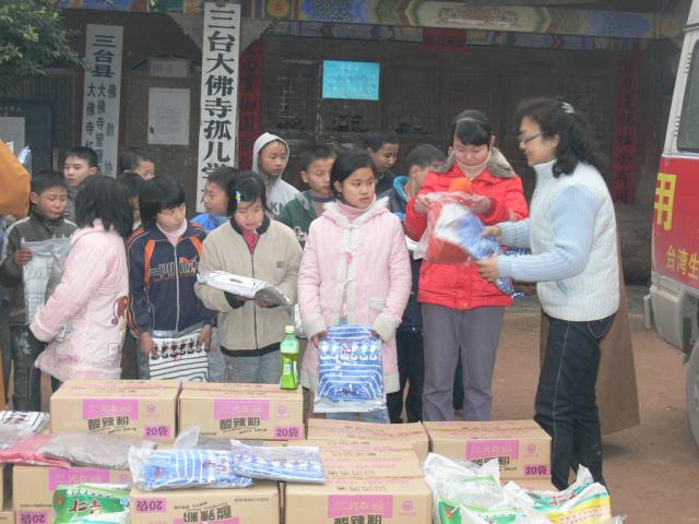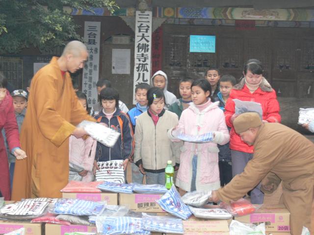 (中国佛网讯)2009年1月17日至18日,由台湾生命电视台、重庆华岩文教基金会募集的价值10万元物资送到北川曲山镇、陈家坝乡,安县茶坪乡和三台县大佛寺孤儿学校。这些物资包括2500件毛衣、45件羽绒服、4000公斤大米、50箱面条、100件方便粉丝、250桶食用油、30床棉絮等,同时,还为10名地震孤儿送去了慰问金。