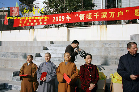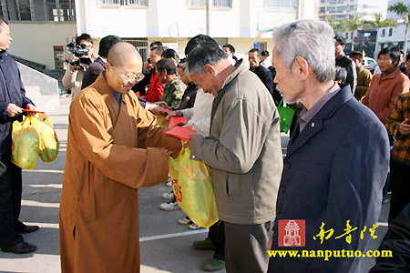 2009年1月14日,福建省厦门市南普陀寺慈善会普陀法师、德鸣法师、通灵法师一行到厦门集美区,参加了由南普陀寺慈善会、集美区慈善会以及厦门慈善总会联合举办的2009年“情暖千家万户”慰问活动。为厦门市200户贫困户送上慰问金和新年礼物,共发放10万元善款,祝愿他们过一个快乐、和谐的春节。