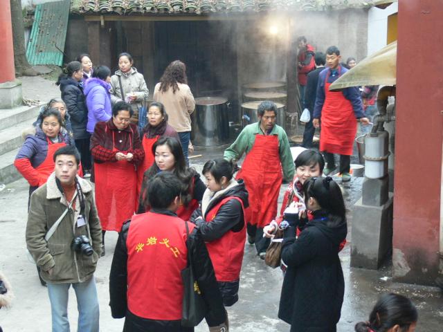 文化研究会在重庆华岩寺华岩鼓楼广场联合举行“戊子年华岩寺腊八节腊祭——祈福活动”及“重庆华岩佛教博物馆预展”庆典活动。考虑到前来华岩寺品尝腊八粥的市民较多,众多的志愿者 们自发前来帮忙,有来自腾讯城市达人官方重庆站的志愿者,有来自重庆交通大学的义工组织、有来自重庆大学社工专业的学生。志愿者 们面带微笑,有序,耐心,细致的组织市民前来品粥,维持参加腊祭祈福法会人员的秩序。
