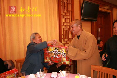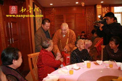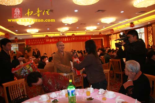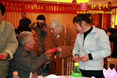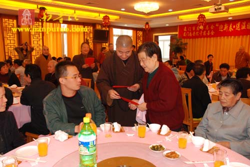 在新年午餐会上,圣辉大和尚、则悟大和尚、蔡景祥会长、黄处长以及左慧敏副局长分别致辞。圣辉大和尚向在座的孤寡老人、特困户致以新年的问候,祝福大家新年快乐,健康吉祥!则悟大和尚、蔡景祥会长、黄处长、钟晓波先生、左慧敏副局长、申淑芳女士、慧然法师、界象法师、普陀法师等人还亲自为孤老、特困户发放了每人500元春节慰问金和新年慰问品。