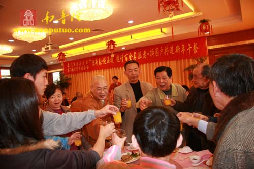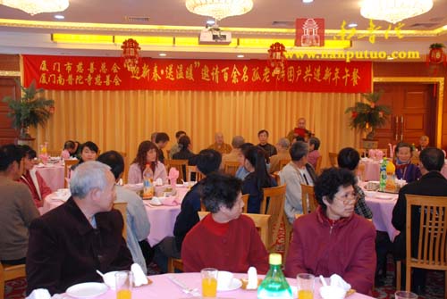 2009年元月18日中午,鹭岛风和日丽,阳光明媚,伴随着浓浓的暖意,厦门南普陀寺普照楼素餐馆内更是温暖如春,洋溢着一片喜庆的气氛。南普陀寺慈善会与厦门市慈善总会在这里联合举行“厦门市慈善总会、厦门南普陀寺慈善会邀请百余名孤老特困户共进新年午餐”,邀请本市思明区、湖里区、市社会福利中心的孤老、特困户,欢聚在南普陀寺普照楼内,共进新年午餐,祝福他们新年快乐、健康幸福!新年午餐会有南普陀寺慈善会办公室副主任正兴法师主持。