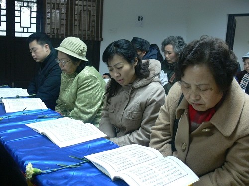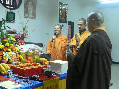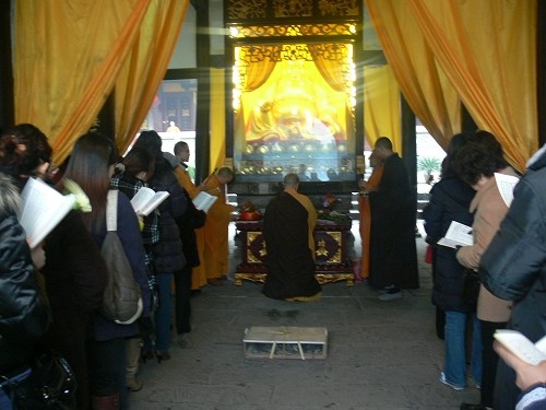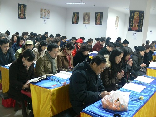上午十点半左右,讲座圆满结束。大家在华岩寺宏樽法师、来圣法师、普济法师、常智法师、惟正法师等法师的带领下,在中华正信读经会进行祈福法会,由重庆佛学院宏樽法师主法,大家手捧鲜花,虔诚又庄重,接着,法师引导大家读诵经典。