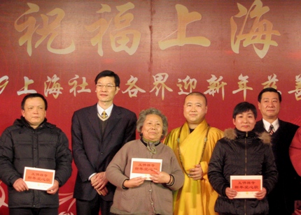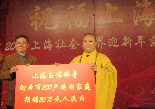 12月31日晚, “2009祝福上海——社会各界迎新年慈善晚会”在上海佛门首刹玉佛禅寺隆重举行,来自市、区有关部门的领导以及社会各界人士600余人出席了晚会。晚会由玉佛寺联合市慈善基金会等18位共同主办。