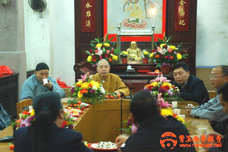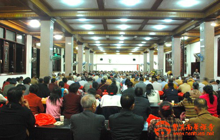 2009年1月19日傍晚,广东省韶关市南华禅寺在斋堂举行了迎春普茶大会。会上南华禅寺方丈传正法师为大家作了精彩开示,当家师法祇法师对南华禅寺过去的一年进行工作总结,曲江区民族宗教局领导也到会发表讲话。