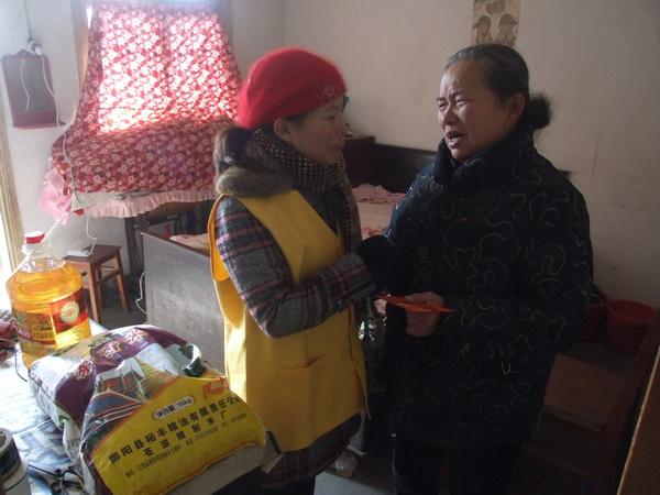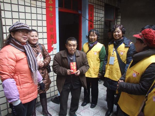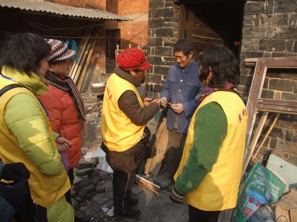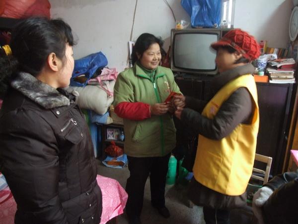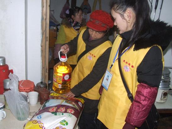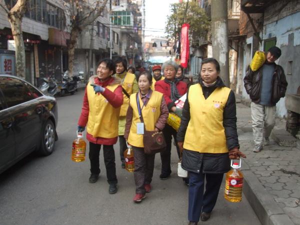 东林慈善功德会的春节慰问活动在九江市开始,辐射到全国各个联络处。九江志愿者们分成几个小组,分散到各居委会,再由居委会工作人员带路,走街过巷,不辞劳苦,把慰问品送到各家各户。穿着黄色东林慈善志愿者服装的志愿者们行走在九江的大街小巷,是那么的阳光,那么的给人欣喜和希望。他们的来访,舒展了困难群众紧皱的眉头,绽放了一张张阳光般的笑脸,温暧了一颗颗对生活失望悲伤的心。