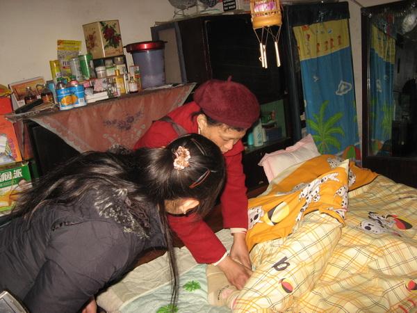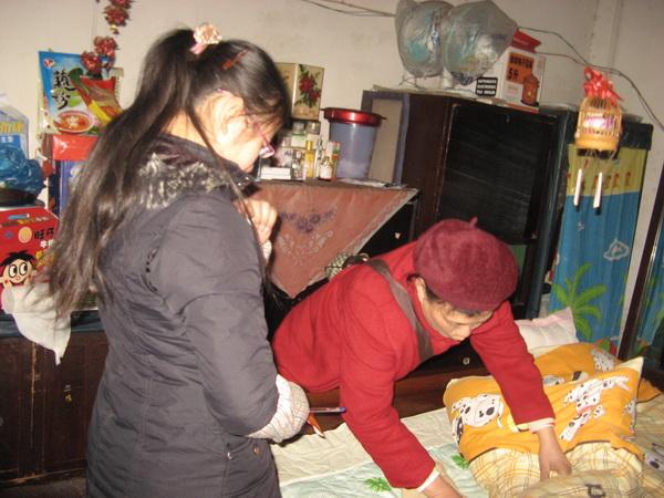 在之后两个多月内,东林慈善功德会的工作人员们将社会的爱带给了这个不幸的家庭,数十次上门为他们一家解决各种实际困难,给予他们一家有力的精神支持,使胡凤兰一家重新燃起了生活的希望。 期间胡凤兰一直挣扎在死亡的边缘,癌细胞已经蔓延到全身及骨髓,在11月上旬,癌细胞的肿块堵塞了肠道,无法排便,生命岌岌可危。她的的全身也随之失去知觉而瘫痪了,这完全击垮了她的意志,好强的她让十七岁的女儿胡晚霞深夜致电功德会求助… 功德会的镜义法师带领工作人员又一次赶到她家,因她的身体过于虚弱经不起任何行动,所以法师紧急叫来了东林慈善门诊部的义工雷医生和雷医生所在的三院科室主任、慈善门诊部的沈医生为她上门治疗。当时医生诊断她已经只剩下三天时间了 … 但是奇迹产生了,至今胡凤兰苍白的脸上泛出了一丝红润,以前滴食未进而现在能每天吃下三碗米饭,虽然身体大半部分依然没有任何知觉,但她心中燃起了希望,希望能顺利度过这次春节。她年仅十七岁的女儿,每天忙里忙外地照顾着母亲和年幼的弟弟到深夜三点,冻裂的小手经常肿得象馒头,但看到母亲的好转,她的脸上也绽开了希望的笑容。 在这段时间,最令人感动的是雷医生对她一家的悉心照顾。两个多月以来,她每分每秒心系胡凤兰一家,随时上门为胡凤兰排除病体带来的各种问题,并帮助照顾她的两个儿女;每天至少一个电话关切地询问病情、嘱咐胡晚霞。记得有一次,胡晚霞出门时雷医生致电没人接听,为此她着急得丢下手中工作又直接去登门了解… 她让胡凤兰一家感受到了亲人的关怀和温暖,使胡凤兰的病体能克服重重险境,走过最绝望的黑暗迎来了一丝光明。 临到春节,功德会工作人员又一次登门送上了各种生活物品和救济金,而胡凤兰一家也表达了对东林慈善功德会以及社会爱心人士由衷的感恩。特别是十七岁的胡晚霞这篇动情的叙述,让功德会工作人员再一次感受到身上肩负的使命。 雷医生在为胡凤兰诊病 我心目中的雷阿姨 2007年正月,我母亲被检查出来患有乳腺癌,这个消息对我们一家来说是一个晴天霹雳。十年前,母亲抛弃所有,独自带着我和弟弟,租了一间小房子,从没有家具到有家具,从没有衣服到有衣服穿。母亲是一个倔强好强的人,就算再苦也不求人,就算再苦,也要让我和弟弟吃饱穿暖,有书读。 那一天,正好是我报名的那天,我拿着卡犹豫不决,我知道现在不是读书的时候,可母亲却毅然说:“去取钱,我就算有一口气,也要让你们去读。”亲人们百般劝母亲去住院开刀,她都不肯,因为没有钱。那时候我并不知道,她心里计算着把钱留给我和弟弟读书。她说:“我连死的工夫都没有。”最后,她选择了吃中药,每天吃半脸盆的中药,她连买糖的钱都舍不得,喝了一大杯,然后去橱柜中夹一口剩下的冷菜吃。一年没有吃荤。喝了一年,到2008年正月,她的身体跨了下来,一病不起,硬坐了一个多月没吃一粒米,含着冰块,躺下去就坐不起来,病得连觉都睡不了。 我以为她明天就会好,一天又一天,一天又一天,我知道,她是不会起来了,我绝望了。母亲说:“不能让你读书,是我一生的遗憾,是我无能为力,你要好好带着弟弟,学会坚强。”我对着她只能哭泣,绝望的泪。 去年将近六月,我休了学,照顾母亲。因为家庭困难,吃了低保,靠政府的一点补助生活,一天,同学的妈妈来看我母亲,联系了东林慈善功德会,帮助我们解决了很多困难。 那一天,我母亲突然从胸部以下完全失去了知觉,大小便不通,肚子肿得很大,我打电话向功德会求救,只能不知所措地蹲在地上哭,功德会的几个姐姐安慰着我,她们叫来了东林慈善门诊部的雷阿姨。雷阿姨走进房间后,叫两位姐姐为我母亲按摩穴位,可母亲还是那么痛苦、苍白、神经的颤动惊动了每个人的心,最后,她还是挺了过来。 自从那次后,雷阿姨时常打电话来问候我母亲、还有家中的情况。原来,孤独无助的我犹如飘零的落叶,最痛恨时间每分每秒都在催促着母亲的生命,结束这一切。我只希望时间能停止,让她能在这一刻永远停留,可叶子还是随着秋的萧索凋落了…我以为落叶会飘得很远,可是被一双手接住了,那是一双充满温暖的手,温暖的包围中有一种特有的解决生命中所有矛盾的能力。 那一天我告诉雷阿姨没有导尿包了,她就让门诊部为我们准备好导尿包及一些消毒器材和药水。她在门诊部极力为我们提供最多的帮助。 那一天,她又风尘仆仆地赶来了,教我如何更换导尿包,因为她担心一旦有急事不能赶来会引起尿道感染,她在电话中一遍一遍叮嘱我要小心。 那一天,她说我弟弟的鼻炎很重,近视也加深了很多,于是她就带着我弟弟去看病,还出钱诊疗,并向眼睛店百般拜托才以很优惠的价格买了一幅很好的眼镜,她经常一遍遍地电话问候我们… 那一天,我告诉她我母亲痛得受不了了,她就向主任询问,顶着感冒给我母亲买来了药。 她无私的爱,如冬日的阳光温暖着我的内心,她仁爱的美,如天上的云彩滴下的一滴泪,她的那种关怀,如春天的早晨品到了一杯香浓的奶茶,让我和弟弟得到了如亲人一般的关怀和安慰。如果说我们饱尝了世间的灾难,那么我们又何其幸运地得到了那么人多的关心。对雷阿姨的感动,我深深保留在心中,永恒地铭记。衷心地说一句:“谢谢”,愿天下所有像雷阿姨一样的好心人一生平安! 雷医生与胡晚霞姐弟交流胡凤