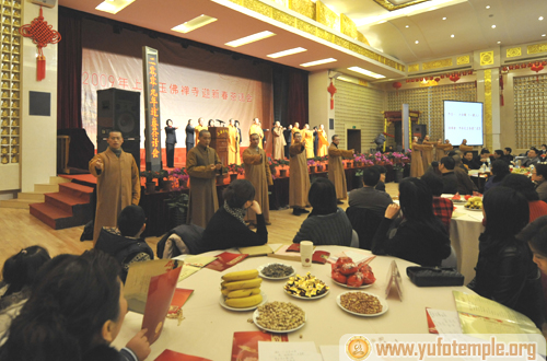 2009年1月15日晚,上海玉佛寺在觉群楼二楼多功能厅隆重举行“2009年玉佛寺迎新春茶话会”。全寺的僧职员工,相关部门的领导,以及其他兄弟寺院的法师、社会各界的专家、学者和护法居士约800余人齐聚一堂,共迎即将来到的2009农历新年。