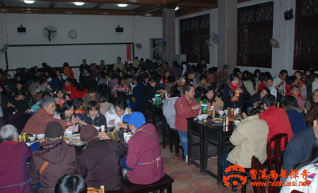 2009年1月21日(农历腊月二十六)傍晚,广东省南华禅寺大摆素斋,宴请四方信众,南华禅寺方丈传正法师带领该寺僧众与各方信众齐聚南华禅寺斋堂,共庆新春。
