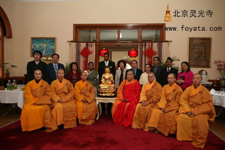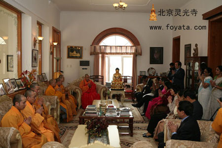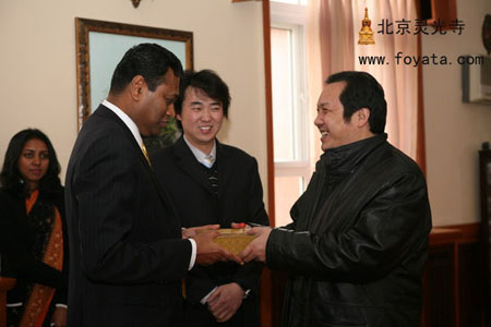 2009年1月16日正午,北京市灵光寺方丈常藏法师及该寺常驻僧众与中国佛教协会国际部翻译王立先生,应邀出席了斯里兰卡驻华大使阿穆努伽玛先生在大使馆举行生日午宴。