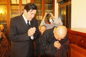台湾地区领导人马英九于2月3日晚上8时,冒著绵绵雨势,亲赴金山法鼓山世界佛教园区,向甫于下午4时圆寂的法鼓山创办人圣严法师,致上最高的敬意。