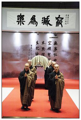 每在来宾瞻礼法相之后,方丈和尚等陪同者都会特别向来宾讲解悬挂于堂中,由书法家杜忠诰老师所写的师父最后叮嘱语「寂灭为乐」以及四句偈「无事忙中老,空里有哭笑,本来没有我,生死皆可抛。」说明圣严法师一向「欢喜看生死」的态度。