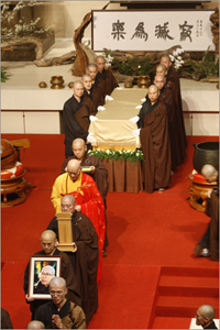 圣严法师的起龛仪式与荼毗大典,恭请法师挚友今能长老主持。起龛前,与法师相交数十年的今能长老,伫立法照前拈香说法,宛似挚友间的交谈。在大殿参于起龛仪式的,还有法师的多位至交道友,包括晴虚长老、广慈长老、传印长老,以及法师留日好友三友健容教授;美国庄严寺住持法曜法师、净耀法师、弘誓学院昭慧法师、弟子林百里等,都到场送别。