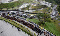 “起!”今能长老一声,覆上华幔的灵龛,由方丈和尚果东法师捧持牌位,首座和尚惠敏法师捧持法照,在八位僧众弟子护送下,缓缓移动。在园区各殿堂观看视讯的信众,也依序在义工们引导下,朝法印路两旁列队,一路绵延至双面观音路的灵山胜境石。看到法师灵龛车队来到,信众们纷纷跪地顶礼,许许多多信众就著湿漉漉的地面,一拜再拜,向师父表达心中难以言喻的感恩。