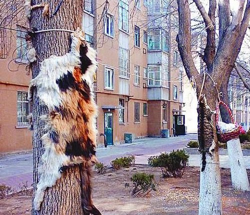 近日,在天涯、华商网等各大论坛都可看到这样一个帖子——《惨无人道,杀死流浪猫吃肉后还剥皮绑在树上》。点击进去可以看到,在某小区一户人家门前的树上,两张猫皮一左一右被绑在那里,绳子分别从嘴部和尾部勒过。