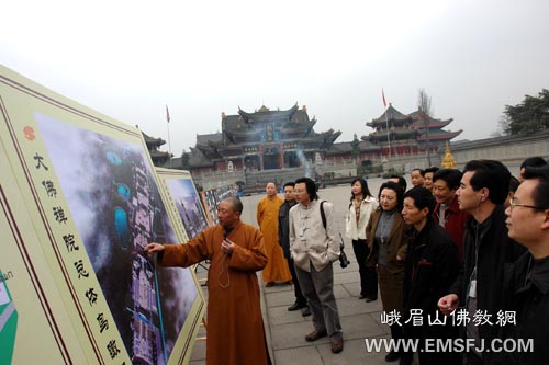 按会议议程安排,上午9时,全体与会人员共75人参观、考察了峨眉山大佛禅院。峨眉山佛教协会会长永寿大和尚、峨眉山大佛禅院都监满霖法师、监院常性法师、副寺镇果法师、永照法师、知客镇祥法师等热情接待,并陪同参观。