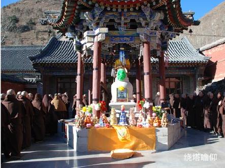 虽说是每年的惯例,但感恩的心,时时刻刻在心间,没有愿老法师的悲愍愿力,就没有普寿寺今天和合共住的僧团。看那青一色整齐而庄严的一线景点,还有阿弥陀佛的圣号在空中荡漾,虽说现在五台山没有一点点绿色的生机,但在五台山那湛蓝的天空衬托下,显得是那么宁静安祥。寒冷的风儿不时会把我们的披风吹起,用眼去看,用耳去听,似乎这一切都已经融入到无限的感恩当中。2008年即将与我们挥手而去,新的一年会悄悄地随着我们的脚印一步一步的跟来,在這辞旧迎新之际,感恩您——敬爱的老法师,是您使我们拥有了这样一个和合的僧团,我们虔诚的祈祷,愿老法师您:“如日影落还再出,早还娑婆度众生”。
