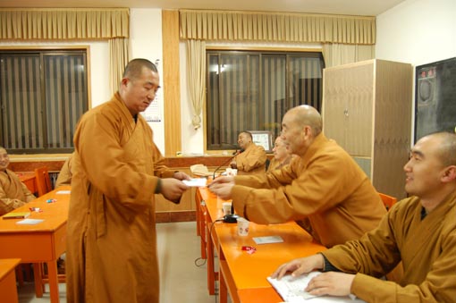大会对上学期评选的优秀生和各班成绩前三名进行了表彰奖励。同时宣布了学院的组织机构和领导分工。学诚大和尚任学院院长,常务副院长为贤空法师,副院长为智超法师、彻性法师。学院下设办公室和教务处两个机构。教务处由果清法师主管,负责教务、学生会、训导等工作;办公室由仁渡法师主管,负责图书馆、档案、外联、财务、后勤等工作。中道法师重点在会上强调了加强纪律的重要性,并对学僧在新的学期起出了新的要求。