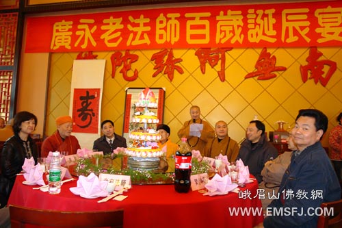 中午11点30分,广永长老百岁寿宴在宝光寺素餐厅隆重举行。寿宴由宝光寺方丈意寂法师主持,四川省宗教事务局局长王增建、四川省佛教协会会长永寿法师、新都区人民政府民宗局局长何江林分别发表了热情洋溢的讲话和贺寿词,近千信众和弟子出席了寿宴,同沾法喜。