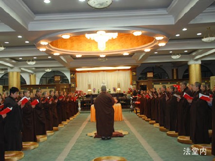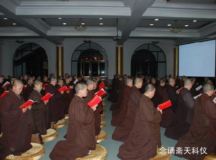 首先是在法堂内香花迎请,接着到大雄宝殿外面正式修供养斋天。法会进行了近两个小时,斋天的场面仍整齐庄严,从生活中细节告诉我们,师父们对法的恭敬,对待每一项活动的认真,不因外界环境而屈服,更不会因个人因素而影响大众。加上师父上人的加持与鼓励,给我们无形的动力与勇气,让我们忘却寒冷,忘记自我,融入在祥和殊胜的氛围中,沉浸在声声不绝于耳的梵音唱念中。