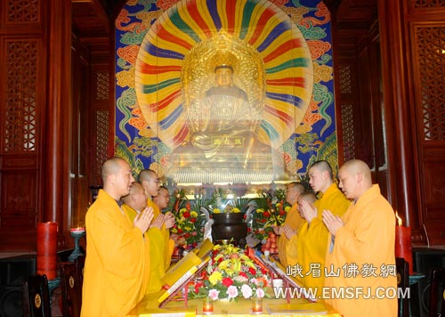 峨眉山寺院在早、晚课集众共修以外,大都还举行诵经、念佛、绕佛等共修活动,做到彼此照顾、互相纠正、同共发心、共成大道!