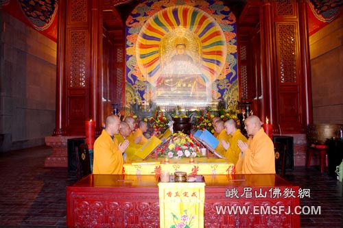 为加强自身的道风和信仰建设,内强素质、外树形象,保持和传承峨眉山先贤大德精进不懈、自度度他的佛教优良传统,峨眉山大佛禅院的法师发心集众诵经共修,努力精进,并将此作为大佛禅院丛林宗风,一直延续下去,顺佛所说,总持不失,心法双忘,自他俱利!希望十方贤达踊跃护持,功德无量!