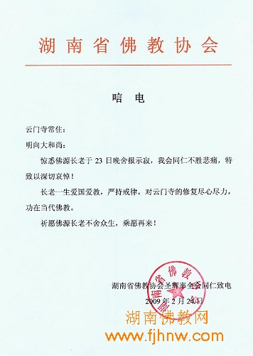 湖南省佛教协会圣辉率全会同仁致电