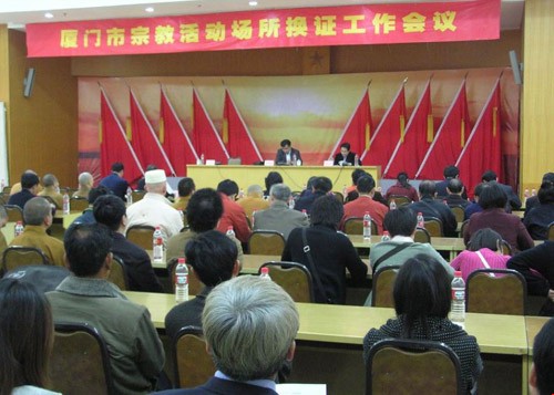 2月9日上午,我市召开宗教活动场所换证工作会议,市、区民族宗教局全体干部及市级各宗教团体副秘书长以上人员、各宗教活动场所负责人120多人参会,会议由蔡永华副局长主持,苏国成副局长受局党组委托作动员讲话,要求各区民宗局、各宗教团体和宗教活动场所要高度重视,周密部署,精心组织,切实做好换证的各项工作,并对换证工作提出五点要求:一要落实工作责任;二要充分调动资源;三要抓好时序进度;四要坚持分类指导;五要讲究工作方法。会上,市民宗局业务三处处长许河山还就换证工作的一些具体操作进行了专题培训。