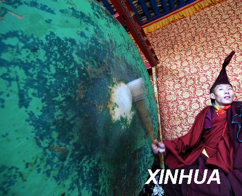 2月23日,一位僧侣在楚布寺跳神仪式上敲鼓。