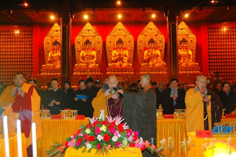 凌晨3点,四众云集,在本寺退居净慧长老、明海大和尚、白洛上师的主持下,举行了庄严的斋天仪式。