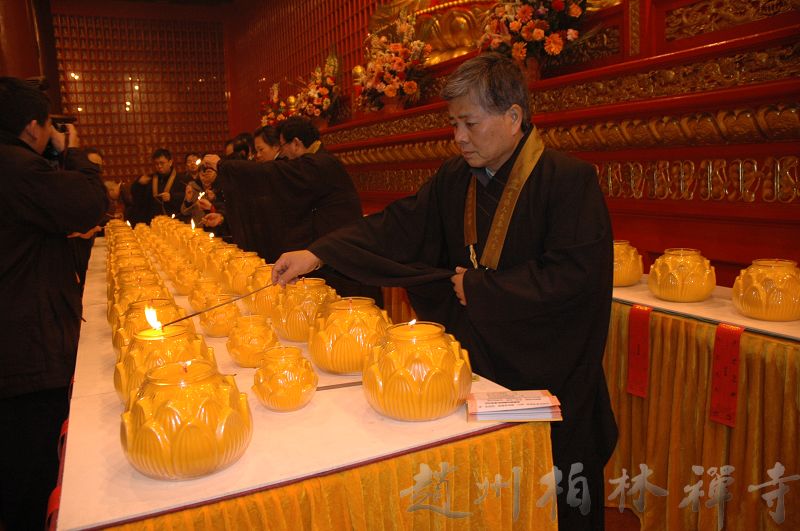 晚上6点半,大众云集万佛楼举行盛大的供灯法会。柏林禅寺的护法檀越共同点燃了万盏酥油灯,千余名信众则依唐代不空三藏所订之仪轨——《普贤愿海灯明供养法》,奉请诸佛菩萨加持与会大众,并为我们的国家、人民祈福,祈愿风调雨顺,三灾不起;国泰民安,法轮常转。一时间,万佛楼内万灯齐明、法音震天,场面蔚为震撼、庄严!
