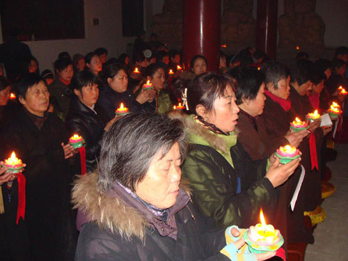 一灯能除千年暗,一灯能开万年光。涟水能仁寺以“关爱众生,造福众生”为理念,于2009年元宵节举行大型点灯法会,晚上七点钟,妙通塔灯火辉煌,威严矗立,在主礼法师的引领下,僧众列队,信徒相拥,约有三千人手持莲花灯,右绕妙通塔,祈愿华夏大地,国泰民丰,万家团圆,咸具安乐。七点四十分,施放的一簇簇烟火腾空而起,直插云天,随即爆裂成五彩缤纷的美丽图案,令所有在场僧众居士爽心悦目,流连忘返。