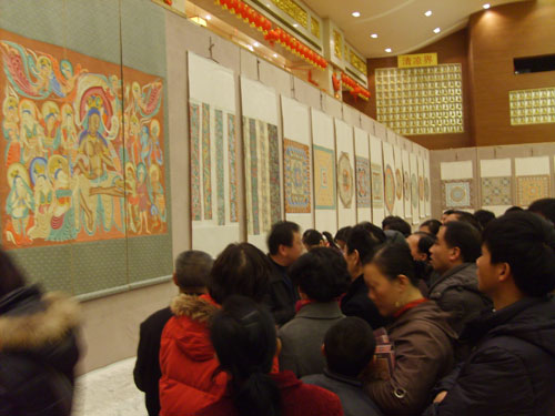 时隔七年,一个以敦煌复原壁画为主题的大型佛教艺术公益展览再现上海,于今天上午10点在玉佛寺开展。本次“2009玉佛祈福迎春大型敦煌复原壁画精品展”,也是“爱是未来大型敦煌壁画复原作品展全国巡回展”上海站的展览,是东敦煌禅艺中心在2002年上海图书馆展出作品为基础的七年新作展,受到了上海各界人士、佛教团体、艺术团体的热烈欢迎,展览现场人流如涌、好评如潮。