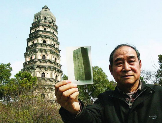 钱玉成展示发现的虎丘塔奠基砖。 1982年,钱玉成从中国社科院考古研究所调到苏州后,就在当时的苏州市修塔办公室工作。从1982年到1987年,修了5年虎丘塔,此后直到21世初退休前的十多年,他每年都要对虎丘塔进行测量、监护。在这一过程中,埋藏着许多历史奥秘的虎丘古塔,深深吸引了他。 2007年9月接到重编《虎丘山志》的任务后,钱玉成将多年来的研究成果进行了梳理,其中,历史上曾有过的4座虎丘塔是他最得意的发现。 唐代以前至少有过3座虎丘塔 “在虎丘塔的位置,历史上至少先后出现过4座塔。 ”钱玉成告诉记者,他推理的脉络是跟着虎丘山上的寺院走的,因为塔是佛教建筑,有庙才会有塔。 第一座塔最迟应出现在南朝时期。有史书记载,东晋时司徒王珣及其弟司空王珉各自在虎丘山中营建别墅,咸和二年(327年),双双舍宅为虎丘山寺,仍分两处,称东寺、西寺。但钱玉成通过查阅历料发现,王珣的生卒年限为公元350年到401年,因此,只能说明东晋时虎丘山上已有寺庙,但当时规模小,名气不够响,直到王氏兄弟舍宅为寺后,虎丘山的庙产从山上扩展到山下,才出了名,他推断第一座塔最早可能就在那时修建起来。到了南朝梁代、陈代,有诗人在关于咏虎丘的诗中写到过“贝塔流光动”,“洞塔耀山庄”的诗句,这是虎丘见于记载的最早的塔。钱玉成说,按照中国建塔史来判断,第一座虎丘塔应该是木结构建筑。 第二座虎丘塔建于隋朝。钱玉成说,在隋朝仁寿年间(公元601年——604年),笃信佛教的隋文帝杨坚为母亲做寿,下诏在全国30个州郡建造舍利塔,苏州是其中之一,塔的式样由隋朝中央政府统一绘制,并将图纸派发各地,以此为依据进行施工。苏州的塔就建在虎丘山寺,在名为“大隋舍利塔”的30座塔中,编号为23。这座塔不过花了几个月就建成了,根据当代有关专家描绘的图样,此塔是3层的方形木塔,有16米高,式样精巧古朴。 已可明确的第三座虎丘塔是唐代时建造的。上世纪八十年代,钱玉成在参与虎丘塔维修时,曾经在塔基,即地下五六十米深处发现了一块唐代残碑,只能读出70多个字,但《朱明寺大德塔》的标题很清晰,当时他就怀疑虎丘山寺在唐代曾经被称作“朱明寺”,而当时寺院中的塔名为“大德塔”。“朱明寺”之名首先在唐伯虎为泛舟虎丘所作的诗句“朱明丽景属炎州”中得到印证。而在考古中的发现也表明,在现在的云岩寺塔前,原址的确有过一座砖木混合结构的唐塔,不同于隋代的木结构塔。 钱玉成说,修塔时,曾经请来上海博物馆的研究人员对虎丘塔底层塔砖进行过年代鉴定,发现年代最早的砖是唐高宗时期的,可以证明为唐代以后建的。而且,关于唐代的虎丘塔,白居易、刘禹锡等唐代著名诗人也都写诗吟咏过。 一座云岩寺塔至少建了60年 现在人们见到的虎丘山云岩寺塔已是第四座塔。关于此塔,钱玉成在研究中也有新的发现,即关于塔的修建年份。此前的观点认为,云岩寺塔建于五代最后一年即后周显德六年(959年),到北宋建隆二年(公元961年)造好,但钱玉成说,虎丘塔高达47.7米,从工程量来说,在当时这么短的时间内是不可能造出来的。 修塔时的发现加深了他的怀疑。那是1984年12月23日,在施工中于东南塔基处发现一块奠基砖,上面刻有“庚申岁七月羊日僧皓谦督造此寺塔”的字样,如果按此前判断的年代推算,庚申年为公元960年,建塔时间缩短为一年半,更不可能。 就此事,钱玉成曾专门致信向国内古建泰斗罗哲文先生求教。罗先生在回信中写道“关于您所发现的虎丘塔的始建年代问题,我很感兴趣,的确两三年的时间是很难完成如此巨大而又精细的工程的”,罗哲文还写道,国内不少古塔实际修建完成都要长达数十年,有的要55年之久。 得到了罗哲文的支持,钱玉成对自己的发现信心倍增。鉴于公元959年的推断是从塔砖上“己末制造”的字样而来的,钱玉成认为,己末年可以是公元959年,也可以是前一个甲子年即公元899年烧制的塔砖,而寺僧皓谦督造寺塔是在公元900年(同样是庚申年)。考古中还发现,虎丘塔内最后一个标志年代的文物是“宋元通宝”铜钱,这是宋太祖登基后发行的钱币,其在位年限至公元976年止,因此钱玉成推断,第四座虎丘塔的建设时间是在公元900年到976年之间。 而塔的竣工日期,是按照塔内发现的另一件文物,即一个摆放佛经的经箱上所写“建隆二年十二月十七日入宝塔”来确定的。钱玉成则认为,这些原本密封在塔内的文物应该在塔建好之前放入的,所以云岩寺塔应该是在公元961年之后才建好的。也就是说,修建这座塔至少花了60余年。 虎丘塔中还藏着许多谜 对于虎丘塔,钱玉成还有更细致的发现,例如现存的云岩寺塔是用130万块砖垒制而成,使用的主要是三种砖,即唐朝的条砖、方砖和明代维修时用的条砖。 不过,相比这些具体的发现,“以物论史,透物见人”才是钱玉成20多年来孜孜探索的根本乐趣所在。他说,从虎丘塔的兴衰可以见到苏州城市的沧桑变化。虎丘塔的每次毁灭和修建,都折射出当时苏州政治、经济、文化的综合情况。例如,唐武宗李炎在位时,崇道辟佛,会昌年间发动了一次大规模的灭佛运动,除长安、洛阳保留两座寺庙,观察使、节度使所在的城市保留一座寺庙以外,其余庙宇全部被下令拆毁。当时江苏一带的节度使在润州(即现在的镇江),而苏州连保留一座庙的资格都没有,虎丘山寺和塔自然都跟着毁了。 而