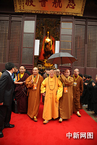 3月28日电 参加第二届世界佛教论坛的其中四百五十位高僧于二十七日参观著名的江南四大名刹江苏常州天宁禅寺,在高一百五十三点七九米有着中华第一佛塔之称的天宁宝塔前,近千位身穿素服的居士在细雨中等待着高僧。(孔建钟 李建军)