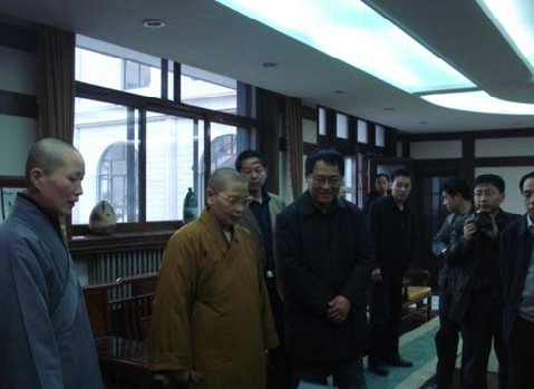 下午17:00左右,中央统战部二处周处长、忻州市统战部王部长、山西省宗教局边局长、忻州市宗教局杜局长等一行20余人来寺参观。当家隆严法师、当家助理寂文法师、知客妙一法师等在客堂接待,并带领大家参观了戒学部、念佛堂、法堂等处,院长师父在方丈楼接待厅给予了热情地接待。