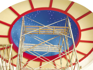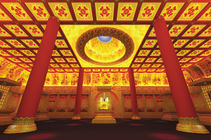 走进展览大厅,正中间就是出土于南京大报恩寺遗址名扬四海的七宝鎏金阿育王塔的主展区,设计师用“天圆地方”来形容他对核心之处的设计理念。崇圣殿的大厅内从地面到屋顶估计有9米高,记者看见施工单位搭起了3层高的脚手架,几名工人正在为圆顶上色,“圆顶共制作了三圈,最大的一圈直径2.4米,一圈比一圈缩小,这样可以体现出一种神秘的层次感。18幅飞天壁画盘旋在圆顶周边,最高一圈内画上蓝色的夜空,然后安装LD最新灯光系统,16盏射灯对应的地方是方形的仿汉白玉基座,座上四边是进口的钢制廊杆。”记者最关心的是基座上究竟陈列什么文物?无疑是大家都想要看到的,美丽无比的七宝鎏金阿育王塔。