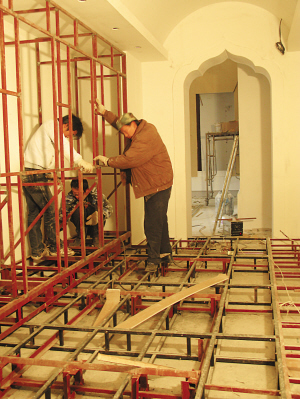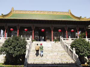 随后,记者从左边的长廊向大成殿的后方――冶山坡迈进。高大的崇圣殿外一片繁忙景象,宽大的平台上,10多名工人正在搭着铁架,这里将是开幕仪式的主要场地,28日那天,来自全世界60个国家和地区的佛教高僧和各界贵宾将再次举行一个特殊的盛典。而这处崇圣殿将是阿育王塔等文物的展览圣地。