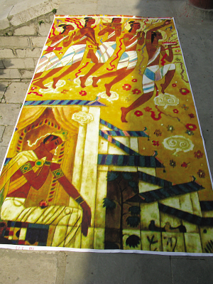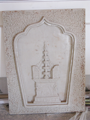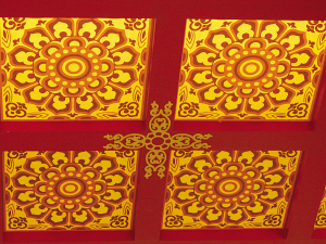 抬头向上,展厅顶部也是别具匠心。设计师将屋顶分布成62个藻井,“这种装饰只有在皇家宫殿建筑中才会出现,每个方格藻井外的间隔区刷成了朱红色,藻井里的灯片绘制了莲花纹样,顶上是灯光区,透过特制的玻璃,图案显得更加华丽。”记者发现,从展板往上到屋顶,还有一圈过渡区,设计师将这一圈设计成了半圆拱形,做什么用呢?“这是壁画区,我们借用敦煌壁画的艺术手法,把佛祖释迦牟尼从梦象受孕、七步莲花、姨母抚育、出游感苦、夜别妻儿、夜渡凡尘、削发更衣、面壁静心、六年苦行、牧女献糜、 树下静悟、 魔女炫媚、众魔败阵、大悟成佛、鹿苑传教、佛陀收徒、佛陀说法等故事画在上面,俨然是一幅释迦牟尼生命历险记。壁画下面台沿前是一圈阿育王塔的浮雕,每块高约80厘米,宽约60厘米。”说着,工作人员拿起一块浮雕给记者看,只见浮雕的造型与展出的鎏金阿育王塔一模一样,而且细部也刻画得非常精致。