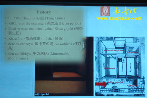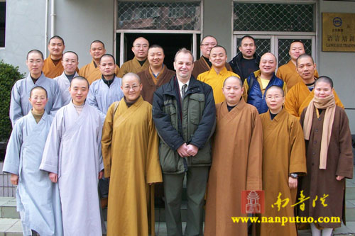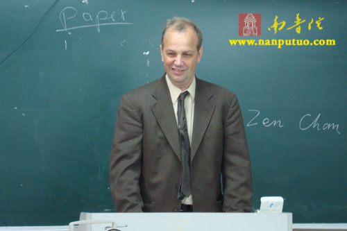 Kopf 教授,德国籍,美国坦普尔大学博士学位,研究日本佛教及比较宗教学,在美国学习和研究多年,然后在日本继续进修三年,学识丰富,目前在香港大学任教。日本佛教自唐代从中国传入至今,经历了漫长的历史,与日本本土文化、习俗相融合,发展出众多宗派和学派。职是之故,《日本佛教》这门课程内容十分庞杂。为了让英语班法师同学能尽可能多的了解日本佛教概况,K教授每天从早上八点开始讲课,晚上八点结束。每天八个小时的英语讲座,是一件十分辛苦的工作。 抵沪第二天(3月2日),由于上海和香港温度相差悬殊,K教授感冒了,但敬业负责的他,仍然坚持授课。第三日晚上(3月3日),为大家介绍并实地展示了日本的茶道。日本茶道用的是沫茶,是唐代传入的。上世纪八十年代,陕西扶风法门寺地宫出土了一套唐僖宗供养佛舍利的金质茶具,以实物有力地证明并再现了唐代饮茶风尚。沫茶及其制作和冲泡这一传统在宋代已经有了很大改变。因此,现代土生土长的中国人,极难真正全面认识这一传统文化。远道而来的德国K教授从日本带回这源自中国却失落于漫漫历史长河中的茶道,无疑对了解日本佛教及其与中国佛教之间的渊源大有助益!3月4日,K教授就先一天晚上的茶道专题,进一步深入介绍,以翔实的图片资料茶道在日本的流派和茶室的构造与茶道的众多讲究等等。K教授先后推荐了三部分别反映佛教在日本社会中的作用、普通民众对佛教的理解与信仰等相关影片同大家一起观看并进行讨论。3月5日,是关于日本佛教批判方面的内容,介绍了西方学者和其他宗教对佛教的理解和审视。K教授对学术具有德国人严谨与认真,同时讲课非常耐心细致,视野开阔,对学员所提的问题常引用西方哲学许多原理,以画图等方式加以说明和解答,教与学的互动非常良好,课堂气氛活跃。 3月6日上午,全体学员按要求针对K教授所介绍的日本佛教任选一主题写一篇文章的提纲,并进行公共演讲,在演讲过程中,很多学员都真诚地表达了对K教授这几天的教学的好感。演讲圆满后,大约十点半左右,英语班全体学员与K教授和陪同他前来的林教授一起在上海外国语大学出国集训部电教楼前合影留念。