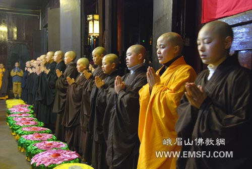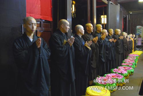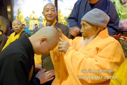 2009年3月17日,农历二月二十一日,恭逢普贤菩萨圣诞纪念日,诸佛欢喜,人天同庆。峨眉山佛教协会于峨眉山报国寺举行庄严的拜师剃度仪式,17名考察僧经过严格的考察合格后,正式拜师、剃度,成为清净沙弥、沙弥尼。其中沙弥10人,沙弥尼7人。