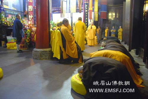 拜师剃度仪式于凌晨6时在峨眉山报国寺大雄宝殿隆重举行。仪式庄严肃穆,如法如律。17名考察僧在引礼师的带领下,遥礼父母三拜,至诚皈依三宝,剃除须发,誓断一切恶、誓修一切善、誓度一切众生……