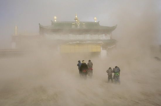 2008年2月17日,四川省阿坝地区的西藏佛教信徒在沙尘暴中去寺院庆祝传昭大法会。成千上万的朝圣者集合起来庆祝传昭大法会,这个法会是藏传佛教最重要的节日之一。