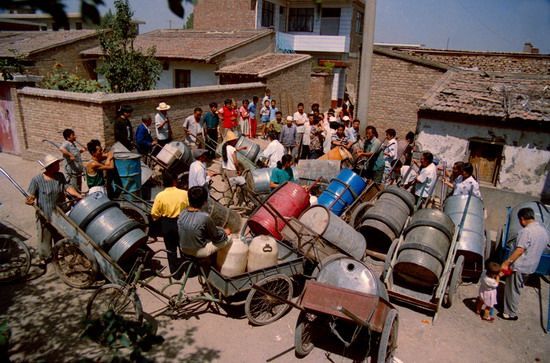 甘肃省是我国水资源短缺出了名的省份 ,全省80%以上地区属干旱. 人均自产水资源量1150立方米,不到全国平均水平一半。全省工农业及生活年需水量122.37亿立方米,可供水量116亿立方米,缺水5.2%,到2010年,全省需水量将达到156.03亿立方米,缺水将达34.5%。(图片拍摄于2000年至2008年)