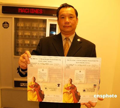 3月26日,中美集邮中心主任魏进发在洛杉矶展示以少林寺为图记的纪念邮戳。