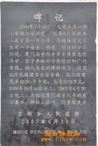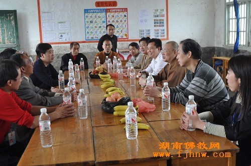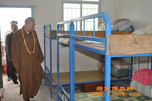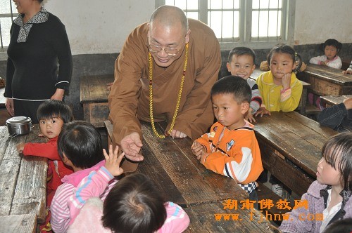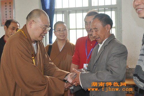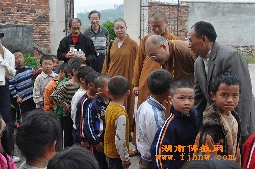 该小学地处湘南贫困山区,周边30多个村寨只有这一所小学。学校条件简陋,课桌椅大多残破。圣辉大和尚一行首先检查了2006年在湖南佛慈基金会联系下由厦门南普陀慈善基金会捐资援建的学生宿舍楼,看到170多个孩子住进了宿舍楼寄宿读书很高兴。在检查中了解到现在正值阳春时节,但山区气候不稳定、早晚温差大,孩子们床上垫的有的却是凉席和薄薄的棉被。圣辉大和尚看到这些以后深感不安。 检查完宿舍楼和教学楼后,圣辉大和尚将5万元爱心款交给了校长,并对校长说:“这5万元一定要用于完善教学环境、用到实处,给孩子们添置些新的课桌椅、新的体育用具和图书资料。而且孩子们年纪尚小,铺盖都这么薄,很容易感冒生病,你们一定要给孩子们添置些铺盖,让他们有好的身体,他们才能更好的学习。夏天炎热的时候再给每个教室和寝室添置些电风扇。让小学的老师们也能在日益改善的环境下,更加兢兢业业,为社会培育出更多的人才。”大和尚慈悲、质朴的语言感动了在场的每一个人,汝城县领导和该校校长纷纷表示一定不会辜负大和尚的期望。