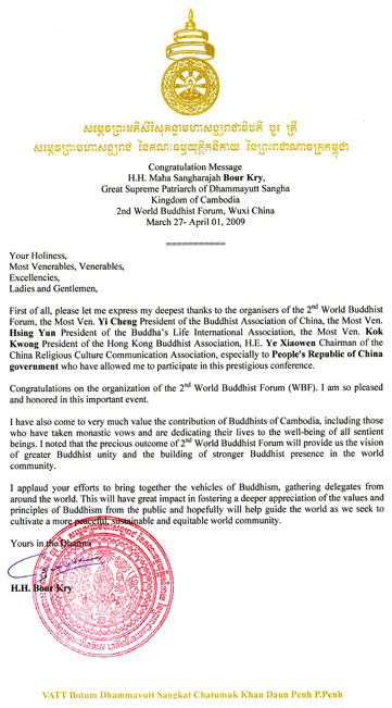 柬埔寨布格里僧王致函祝贺“第二届世界佛教论坛”即将举行