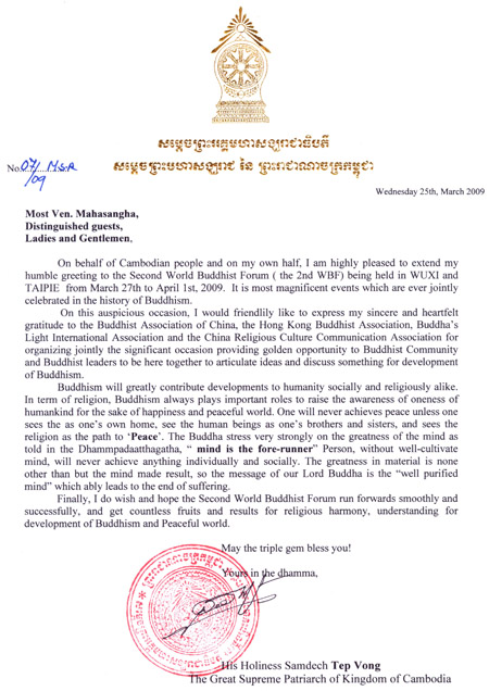 柬埔寨狄旺僧王致函祝贺“第二届世界佛教论坛”即将举行,贺信中文翻译版如下: