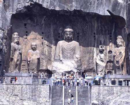 这是一所平面呈马蹄形的超级规模的露天大龛,宽约33米,深约40米,在环着正、左、右三壁下方设置的倒凹字形低坛上,雕刻出了背依岩壁的大卢舍那佛像和二弟子、二菩萨、二天王、二力士像,拱卫着中部的主尊佛。这就是初唐典型的列像窟排列雕塑人物的方法,只不过是这所大像龛太大了,所以把它处理成了露天的形式。卢舍那是印度梵语“光明遍照”的意思,是释迦牟尼的报身。该主像的身高17.14米。在这尊不同寻常的佛像身上,艺术家们雕出了健美简洁的躯干,典雅庄严的神态,秀美的双目俯视着众生,面含着亲切与慈祥,表现出了精湛的艺术造诣。与中国所有的唐代佛像相比,它都是不相同的,因为它更多地反映着人的属性,包含着母性般的慈爱。有的学者认为,这尊卢舍那佛是按照武则天的面形雕造的,可以作为武则天的化身佛像。这个观点是很有道理的,因为在当上皇后不久,武则天便很快显示出了卓越的政治才能,主宰了军国大事。武则天对于这项不朽的艺术工程极为关切,公元672年,她特意施舍了自己的脂粉钱2万贯作为赞助。三年后,宏伟的大像龛圆满完成了,它如同明亮的北斗星,在佛教艺术的星空中永远是那样的夺目,那样的与众不同。