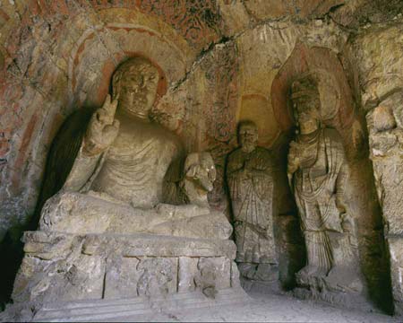 河南洛阳龙门0104号(宾阳北洞)正壁主佛及左侧弟子菩萨